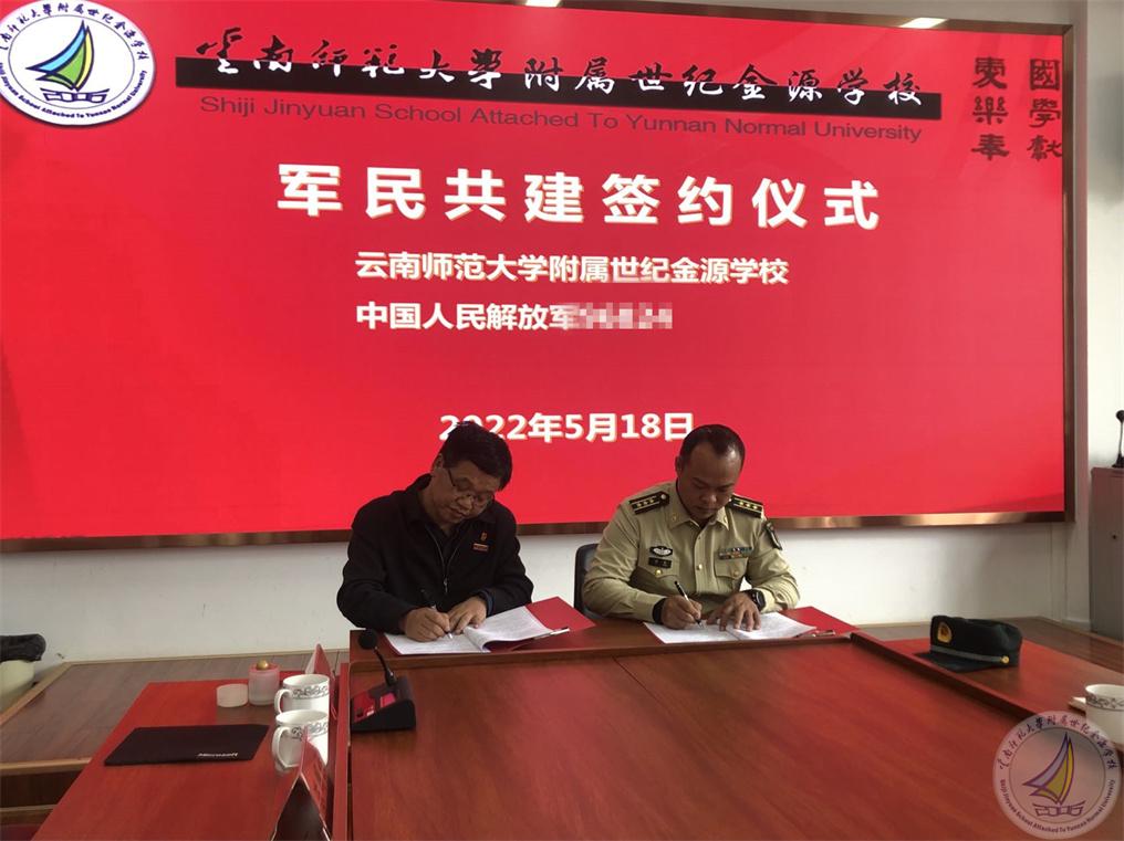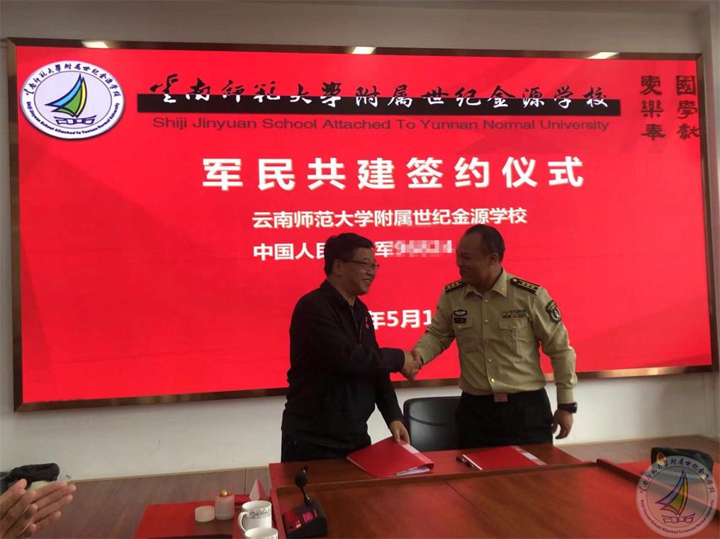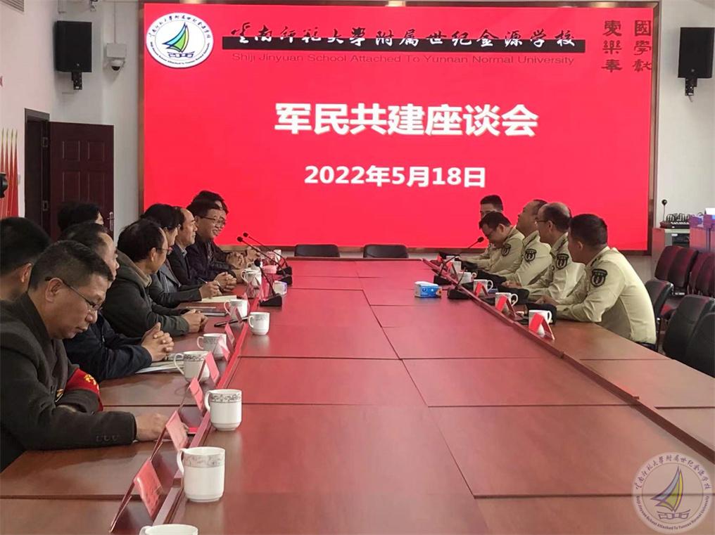 部队领导在讲话中表示,云南师范大学附属世纪金源学校是一所有特色的学校,环境优美、成绩突出。感谢学校对部队的信任、认同和鼓励,希望双方加强合作交流,进一步整合双方资源,充分发挥各自优势,互帮互助、共同发展、共同提高。在轻松和谐的气氛中,双方针对新时代国防教育、革命传统教育、军民共建工作、学生军训工作等问题进行了深入细致的交流,共同探讨如何做好新时代军地共建活动,探索军地共建新思路。